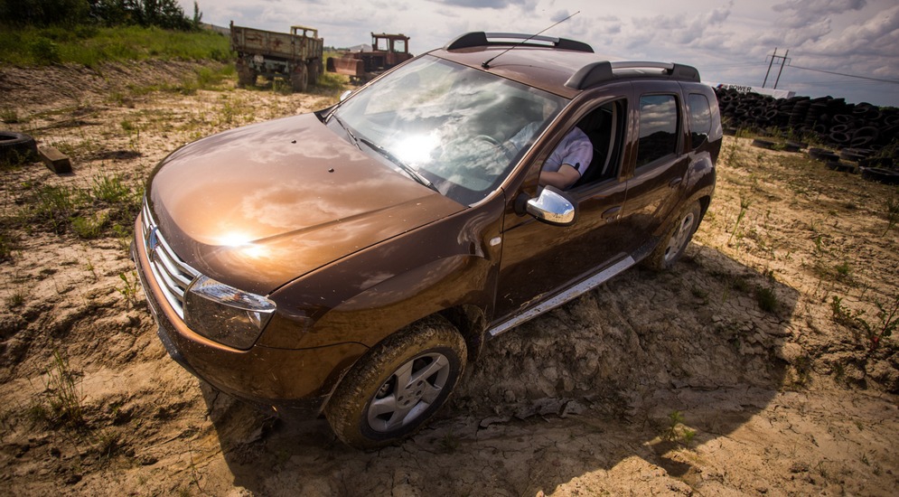 Но сначала разминка. А если быть точнее, проверка геометрических параметров машины. Они по-прежнему очень радуют. Максимальный клиренс в 210 мм, минимальные свесы спереди и сзади с очень правильной формой бамперов позволяют Renault Duster заявлять внушительные углы въезда и съезда: 30 и 36 градусов соответственно. Добавляют уверенности и внушительные для кроссовера хода подвесок, длину которых можно оценить при диагональном вывешивании. Кстати, из последнего Дастер выбирается хоть и с легкой заминкой, но без проблем. А вот чего машине не хватает, так это защиты днища. Хотя все механизмы грамотно убраны в горизонтальную плоскость и не торчат, на перегибах Дастер порой бьётся выхлопной системой о выступающие камни.