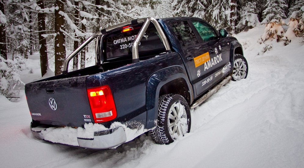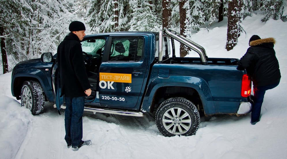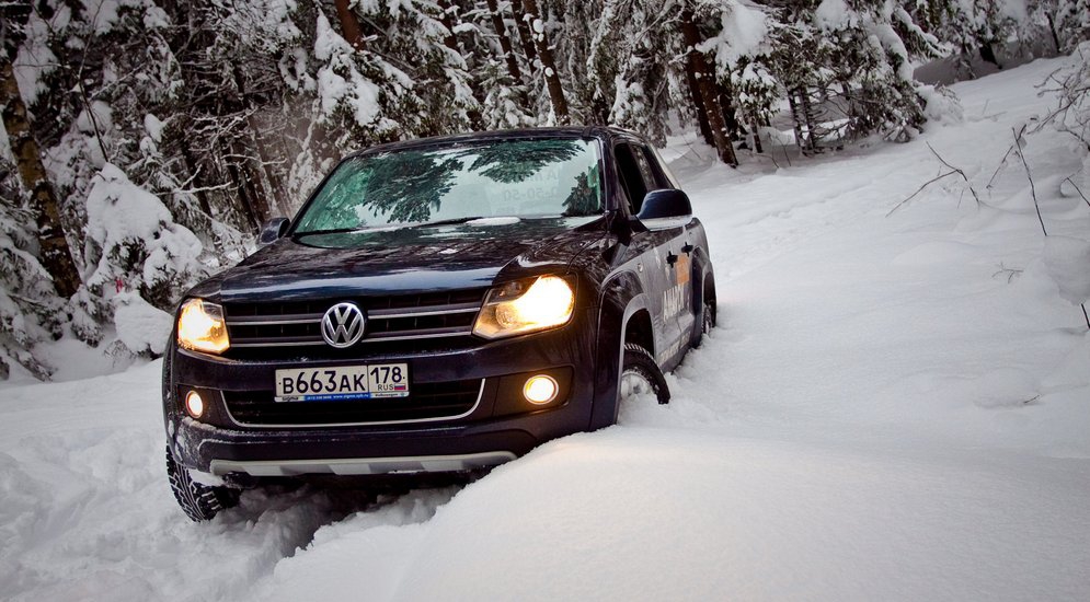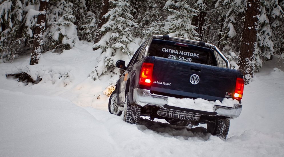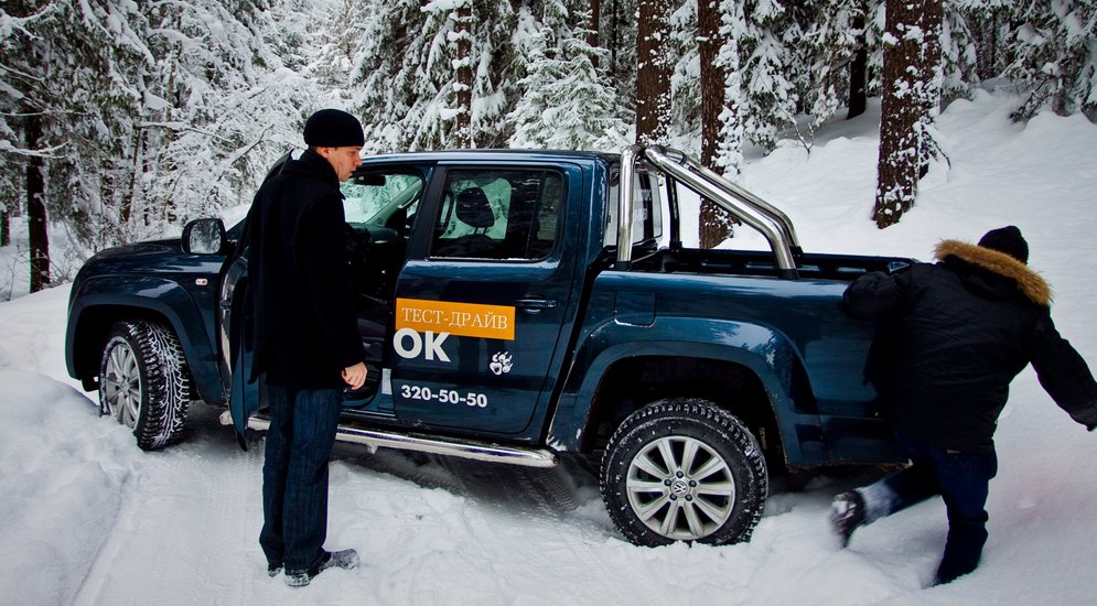 Медленно сдаем задним ходом и очевидно промахиваемся, Amarok левым бортом сползает в кювет. Колеса отчаянно пробуксовывают. Задействованы все блокировки, «понижайки» и «офф-роады»… Не хватает буквально чуть-чуть… Люди приходят на помощь: конечно, на снегу помощь в толкании 2-тонного автомобиля не слишком эффективна, но вызывать эвакуатор, расписавшись в собственном бессилии, не хочется.