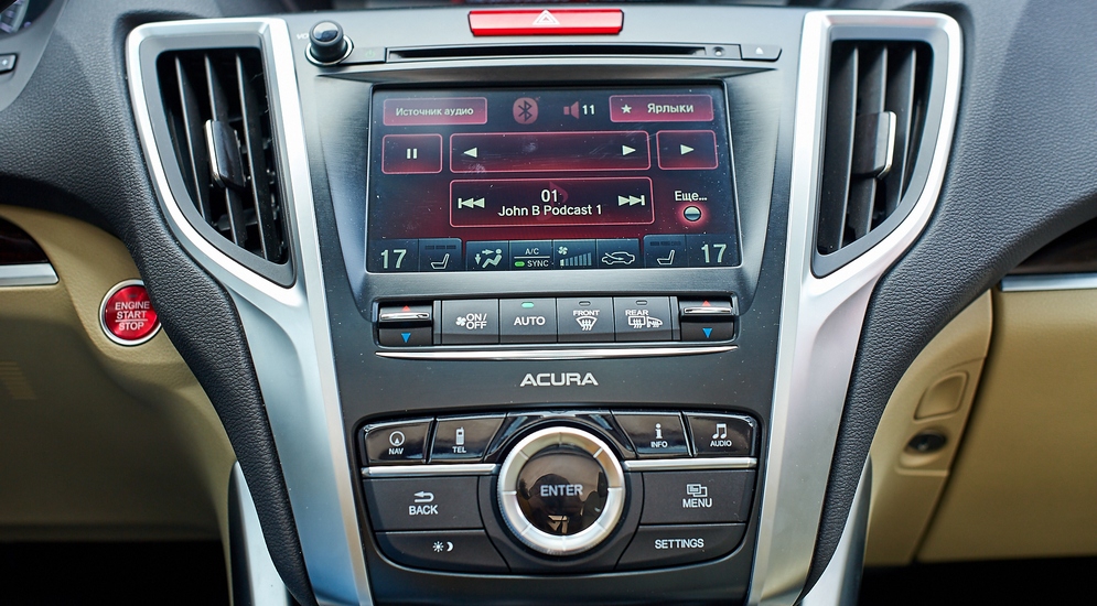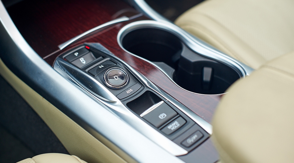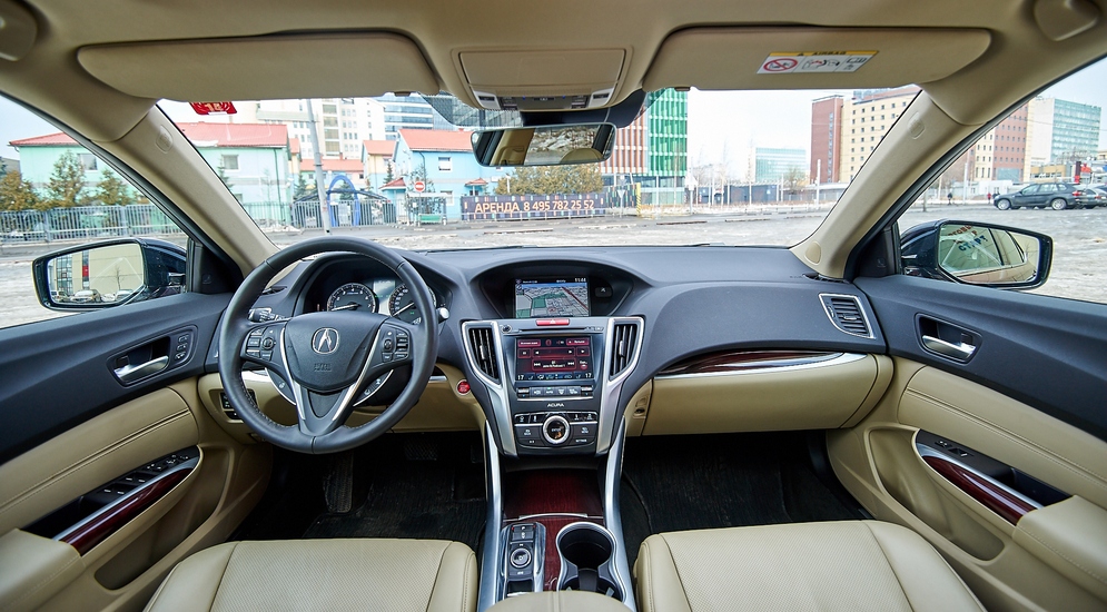 Внутри просторно, но только спереди. Задним пассажирам придется потесниться — и потолок низковат, и запаса места для ног мало. В этом TLX уступает актуальному Accord. Но никто и не говорит, что TLX надо использовать с шофером. Это автомобиль для водителя, и для него американские и японские инженеры постарались на славу: в TLX, пожалуй, самая удобная посадка в сегменте. Все под рукой, но нигде ничего не давит, не стесняет движений. Будто делали "под тебя". Пухлый руль с приятным ободом и удобными "крутилками" на спицах, простые и информативные приборы, явно подсмотренные у BMW, везде дорогой пластик или кожа. Солидно, добротно. Но куда дели рычаг АКПП?
