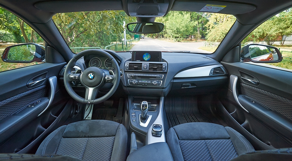 Осмотр интерьера оставляет мало впечатлений. Здесь все то же самое, что и в салоне простой 2 series. Та же передняя панель, те же сидения. Черный пластик и алюминий. Минималистично, даже слишком. Красиво? Едва ли. Удобно? Более чем! Но если спереди, как и в большинстве современных BMW, могут спокойно разместиться два Голиафа, сзади даже самому компактному Давиду будет тесно. В этом плане хэтчбек 1-й серии удобнее, особенно если он пятидверный.