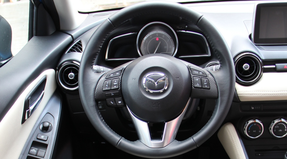 Руль (конечно же, с электроусилителем), легкий на парковке, на прямых проспектах наливался приятной полнотой. Педали расположены на своих местах, не тугие и не чрезмерно чувствительные. Акселератор оказался напольным (как у "старших" моделей Mazda), сцепление — со слегка растянутым ходом, что было удобным в двух попавшихся на маршруте пробках.