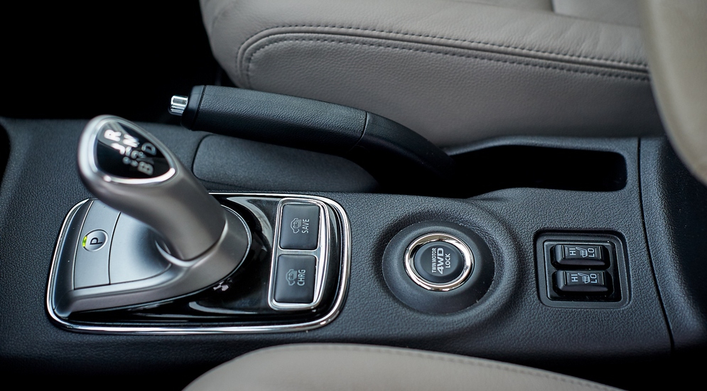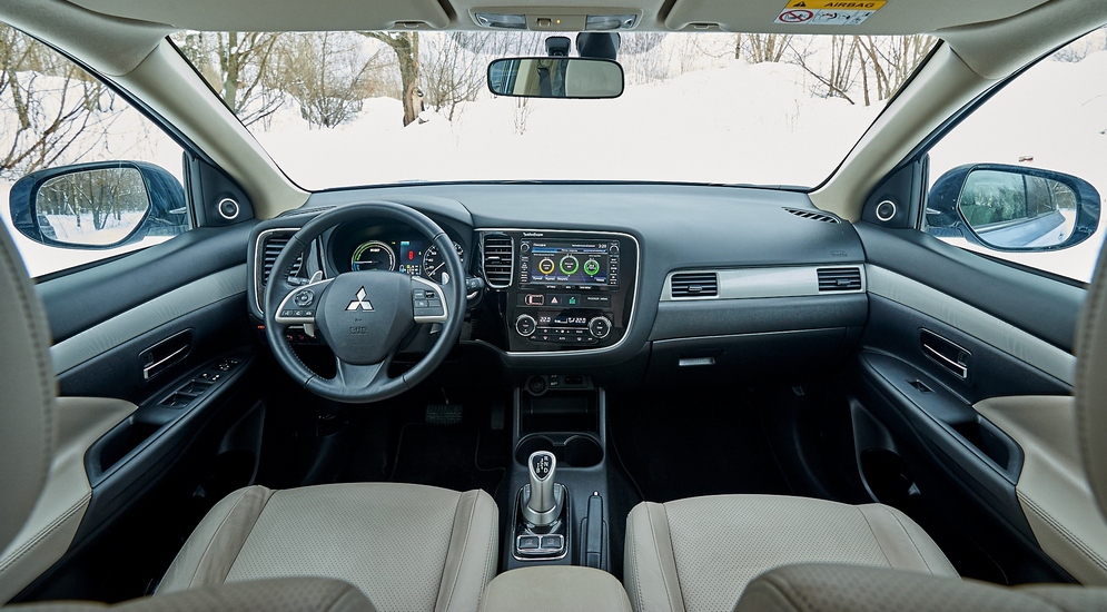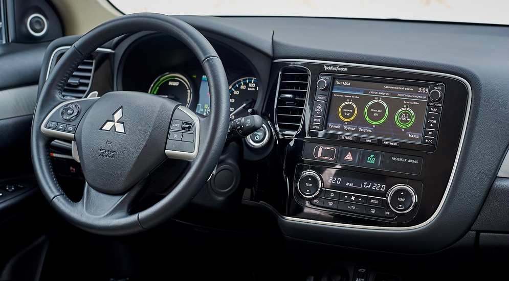 Ах да, я же не сказал ничего про внешность и салон PHEV... А сказать, в общем, нечего. Outlander — он и есть Outlander. Снаружи — чуть измененная решетка радиатора, окрашенный в цвет кузова нижний периметр, светодиодные задние фонари и все. Внутри отличить бензиновую версию от гибридной можно только по селектору режимов движения, который мне напомнил... Неважно. Несерьезный он какой-то, этот селектор. Да, панель приборов тут тоже другая — вместо тахометра вставили указатель режимов расхода энергии, а на дисплей навигации можно вывести анимацию, показывающую режим работы машины в реальном времени. Всё.