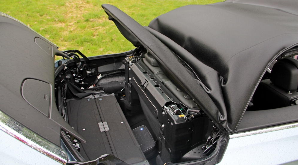 Еще один нюанс, порадовавший и одновременно удививший, – трансформация багажника, предусмотренная несмотря на то, что за спинками заднего сиденья устроен отсек для укладки крыши в «летнем варианте». Спинку сиденья можно сложить, нажав в багажнике специальную кнопку. На фоне этого композиционно-пространственного изощрения уже не столь значимы цифровые показатели объема. А они тоже достойны уважения: 280 л /380 л /750 л в зависимости от положения верха и спинки сиденья. Практичный кабриолет – звучит непривычно, но оказывается, может быть близко к правде.