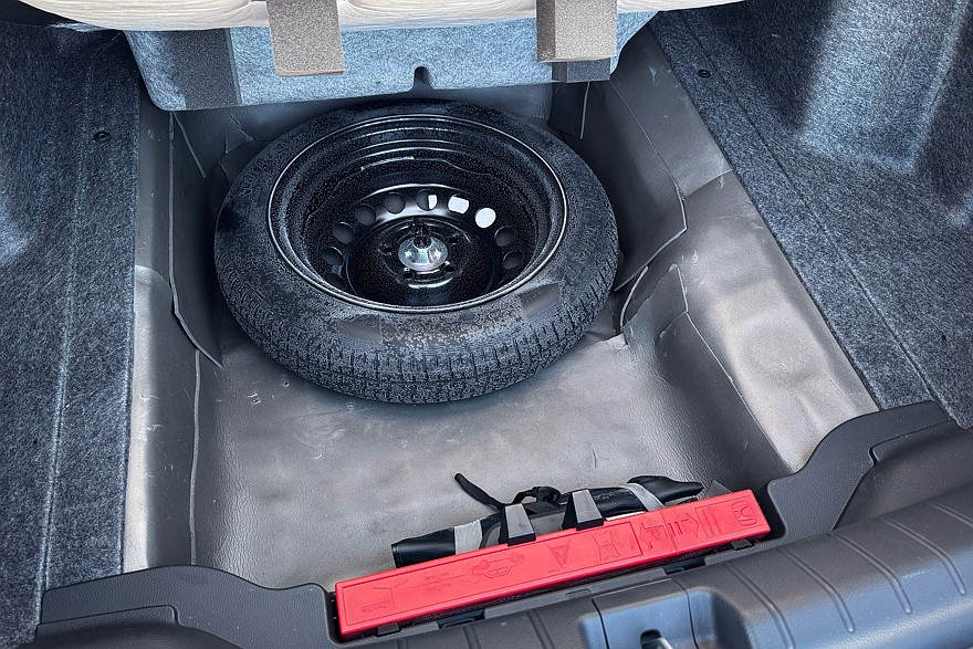 В разложенном состоянии столик фиксируется специальной защёлкой, жёстко прикрепляясь к торцу консоли между креслами. И в подлокотнике ещё осталось место для пары подстаканников. Спинка дивана не складывается, зато есть лючок для длинномеров. Багажник можно назвать объёмным, жаль только, что у крышки нет внутренней ручки. В подполье спрятана докатка и ещё осталось место для инструментов и прочих мелочей.